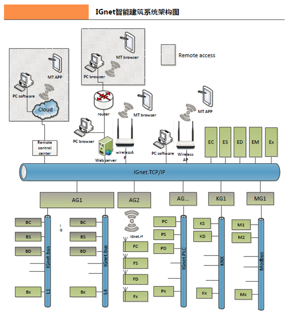 兼容歐洲及其它國際標準的智能建筑系統(tǒng)通信協(xié)議IGnet,約定了規(guī)模化建筑群中遠程通信、遠程控制、數(shù)據(jù)交換、聲音及圖像傳輸?shù)认嚓P(guān)信息傳輸?shù)膮f(xié)議??蓾M足特大規(guī)?;ㄖ焊咂焚|(zhì)傳輸?shù)膽眯枨蟆R虼丝梢越鉀Q中國大型工業(yè)智能化的一體化技術(shù)難題。